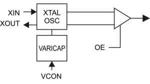 Osobną kategorię źródeł częstotliwości wzorcowej stanowią oscylatory VCXO (Voltage Controlled Crystal Oscillator). Od strony technicznej VCXO są zbliżone do TCXO, przy czym przestrajanie odbywa się z użyciem zewnętrznego napięcia sterującego, dostarczanego przez jedno z wyprowadzeń układu – nie zaś, jak miało to miejsce w TCXO, za pomocą wbudowanych obwodów analogowych. Z uwagi na niewielki zakres przestrajania (na poziomie ±100...200 ppm) ten typ układów wykorzystywany jest przede wszystkim w roli generatora VCO w wąskopasmowych pętlach PLL, dekoderach telewizyjnych, dekoderach MPEG, urządzeniach mikrofalowych czy też teleinformatycznych. Innym zastosowaniem VCXO są generatory stałej częstotliwości referencyjnej, które z uwagi np. na zmienne warunki środowiska wymagają elektronicznej kalibracji, dokonywanej bez fizycznej ingerencji w układ elektroniczny – wszak do wysterowania wejścia VCXO można użyć np. przetwornika DAC lub potencjometru cyfrowego. Oscylatory VCXO występują zarówno w wersjach gotowych (najczęściej stosowane są obudowy ceramiczne, znane z rezonatorów i generatorów SMD), jak i w postaci układów scalonych przeznaczonych do współpracy z zewnętrznym „kwarcem” – przykładem takiego układu może być PL500-37 marki Micrel, oferowany w obudowach SO-8, SOT23-6 oraz w postaci wafla krzemowego. Wykonany w technologii CMOS układ współpracuje z rezonatorami o częstotliwości od 36 do 130 MHz i może być zasilany napięciem 2,5 V lub 3,3 V. Schemat blokowy tego prostego układu został pokazany na rysunku 12.