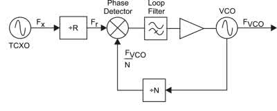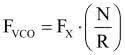 Uproszczony schemat blokowy syntezera częstotliwości typu integer-N (z całkowitym współczynnikiem podziału) został pokazany na rysunku 16. Zasada działania samej pętli PLL jest identyczna, jak opisano wcześniej, różnica polega natomiast na wprowadzeniu dzielników częstotliwości: R na wejściu sygnału odniesienia Fx (w przykładzie jego źródłem jest TCXO) oraz N pomiędzy wyjściem VCO a wejściem detektora fazy. Pętla stabilizuje się w takim punkcie pracy, dla którego sygnały doprowadzone do wejść detektora fazy są nie tylko przesunięte o stały kąt fazowy (np. 0° lub 90°), ale także... identyczne pod względem częstotliwości. Oznacza to zatem, że w stanie synchronizmu zachodzi równanie (1):