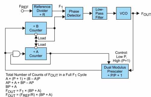 Częstotliwość sygnału wyjściowego VCO może zatem być ustawiona w bardzo szerokim zakresie. Przykładowo syntezer z TCXO o częstotliwości Fx=10 MHz i dzielnikami ustawionymi na: N=50, R=2 osiągnie częstotliwość wyjściową FVCO=250 MHz. Co więcej, częstotliwość tę będzie można przestrajać z krokiem równym 5 MHz (10 MHz/2), zmieniając wartość dzielnika N. Aby poprawić rozdzielczość częstotliwościową, można rzecz jasna zwiększyć stopień podziału N (np. do 500) i nastawę dzielnika R (do 20). W takim przypadku pętla nadal generowałaby częstotliwość podstawową równą 250 MHz, jednak krok przestrajania byłby równy 500 kHz.