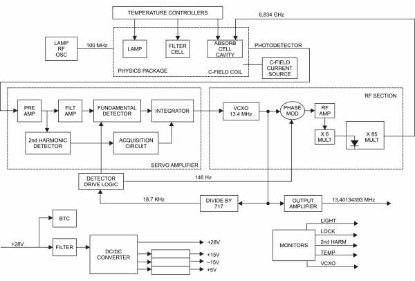 - Zegary rubidowe – klasyczny model budowy wzorców rubidowych opiera się na oscylatorze w postaci szczelnej komory, wypełnionej parami rubidu o wysokiej temperaturze. Do wzbudzenia atomów stosowana jest wyładowcza lampa rubidowa, umieszczona na jednym z końców komory – przy drugim znajduje się fotodetektor, sprzężony ze wzmacniaczem fazoczułym oraz oscylatorem, zdolnym do pracy z częstotliwością 3,417 GHz. Atomy rubidu są cyklicznie pobudzane przez mikrofale, przechodząc do stanu przejściowego, w którym absorpcja światła z lampy wyładowczej jest najsilniejsza. Zastosowanie zamkniętej pętli sprzężenia zwrotnego sprawia, że układ rezonuje na wspomnianej częstotliwości, wynikającej z różnic pomiędzy poszczególnymi poziomami energetycznymi.