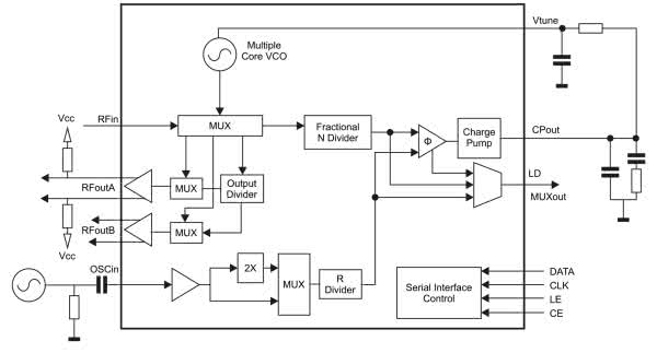 Na koniec ekspresowego przeglądu zasady działania pętli PLL i syntezerów częstotliwości warto przedstawić przynajmniej jeden obrazowy przykład nowoczesnego rozwiązania tego typu. Scalony syntezer fractional-N o oznaczeniu LMX2581 marki Texas Instruments (rysunek 18) integruje w sobie rozbudowaną pętlę PLL z zespołem dzielników, multiplekserów, pompą ładunkową do przestrajania VCO oraz… samym oscylatorem szerokopasmowym o częstotliwości wyjściowej do 3,76 GHz. Potężny układ, który do pracy wymaga zaledwie garstki elementów zewnętrznych (w tym źródła częstotliwości odniesienia, np. TCXO lub OCXO, a także pasywnej sieci pełniącej funkcję filtra pętli), ma wymiary obudowy równe 5,0×5,0 mm i umożliwia wygodne sterowanie za pośrednictwem 3-liniowego interfejsu szeregowego.