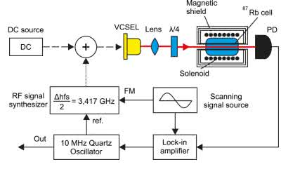 Wzorce rubidowe przeżywają obecnie swój renesans i zyskują popularność dzięki technologii CPT (Coherent Population Trapping) – w tym przypadku do pobudzenia par rubidu wykorzystywana jest miniaturowa struktura lasera półprzewodnikowego typu VCSEL, modulowana przez syntezer mikrofalowy (rysunek 20).