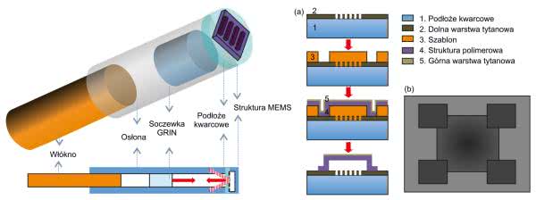 Zasada działania tych elementów bazuje na mikromechanicznej siatce dyfrakcyjnej, która wytworzona jest w sensorze. Wraz ze zmianą temperatury układu MEMS wygina się on, ponieważ wykonany jest z dwóch materiałów o różnych współczynnikach rozszerzalności cieplnej – jedną jest tytan, a drugą parylen (rysunek 9). Odczyt temperatury realizowany jest za pomocą lasera i fotodiody, sprzęganych do światłowodu, na którego końcu znajduje się omawiany sensor, podobnie jak dla termometrów światłowodowych.