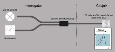 W światłowodowym sensorze temperatury (konstrukcję takiego sensora pokazano na rysunku 7) płytka wykonana z GaAs umieszczona jest na końcu światłowodu, a na płytce znajduje się zwierciadło. W ten sposób światło wychodzące ze światłowodu przechodzi przez półprzewodnik, odbija się od zwierciadła z powrotem do światłowodu. W ten sposób, za pomocą jednego włókna, można mierzyć absorpcję płytki GaAs, znajdującej się w innym miejscu. Jeśli do światłowodu, przez łącznik „Y”, podłączymy źródło światła (do jednej gałęzi) i spektrometr (do drugiej gałęzi), możliwy jest pomiar widma absorpcji GaAs. Jeśli jako źródło światła zastosujemy np. laser lub diodę LED o wąskim pasmie emitowanego światła, które w dodatku ma tak dobraną długość fali, że znajduje się na poruszającej się krawędzi absorpcji (rysunek 8), to wystarczy pomiar natężenia światła wychodzącego z drugiej gałęzi, aby określić, w jakim miejscu krzywej jesteśmy, a co za tym – jaka jest temperatura.