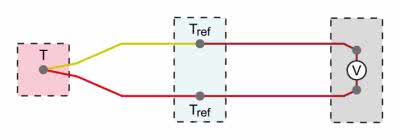 Miejsce styku drutów termopary ze złączem w układzie pomiarowym jest drugim złączem obwodu termoelektrycznego, dlatego też konieczne jest poznanie jego temperatury (Tref lub Tcold). Kiedyś złącze to utrzymywało się w temperaturze zera stopni Celsjusza, poprzez zanurzenie w wodzie z lodem. Sposób ten jest jednak wybitnie niepraktyczny w czasach rozpowszechnienia scalonych i niedrogich sensorów, które mogą precyzyjnie zmierzyć temperaturę złącza termopary, które historycznie nazywane jest „zimnym końcem”. Oprócz temperatury mierzy się także napięcie na termoparze, które generowane jest przez siłę elektromotoryczną, wytwarzaną na „gorącym końcu” termopary.