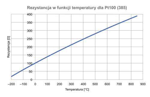 Innym rodzajem sensora temperatury jest termistor bazujący na elemencie platynowym. Z uwagi na to, że medium aktywnym sensora jest platyna, sensory z rodziny Ptxxx mają szereg unikatowych własności, które zostały wyróżnione osobnym rozdziałem artykułu. Temperaturowy współczynnik rezystancyjny platyny wynosi 3,9×10...3 K–1 – jest to jeden z najwyższych współczynników α dla metali, co oznacza, że rezystancja sensorów wykonanych z tego metalu zmienia się z dużym nachyleniem – układ jest relatywnie czuły na zmiany temperatury. Dodatkowo, rezystancja w funkcji temperatury sensorów Pt100 jest niemalże liniowa (rysunek 2), co niezwykle upraszcza przeliczanie mierzonej wartości na temperaturę.