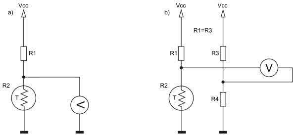 Typowe układy pomiarowe z termistorem nie różnią się niczym od typowych układów do pomiaru rezystancji. Najprostszym jest dzielnik rezystancyjny, złożony z termistora i rezystora – napięcie wyjściowe dzielnika zmienia się wraz z rezystancją termistora (rysunek 1a). Jest to najtańszy i najprostszy układ, pozwalający na implementację pomiaru temperatury. Jeśli wymagana jest większa dokładność pomiaru, sięgnąć należy po bardziej złożony układ mostkowy wraz ze wzmacniaczem różnicowym (rysunek 1 b). Układ tego rodzaju omówiliśmy szerzej w EP 12/2021 i EP 1/2022.