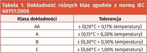 Czujniki Ptxxx są dostępne w różnych klasach dokładności. Najpopularniejszymi klasami dokładności są AA, A, B i C, które są zdefiniowane w normie IEC 60751. Określa ona wartości tolerancji sensora – maksymalną odchyłkę od rzeczywistej temperatury. Ponieważ czujników platynowych nie można wyregulować w celu kompensacji błędów, należy kupić czujnik o odpowiedniej dokładności do danej aplikacji. Błędy czujnika można korygować na poziomie toru pomiarowego za pomocą współczynników korekcyjnych, ale nie jest to optymalne rozwiązanie. W tabeli 1 zawarto tolerancje różnych klas dokładności (zgodnie z IEC 60751:2008).