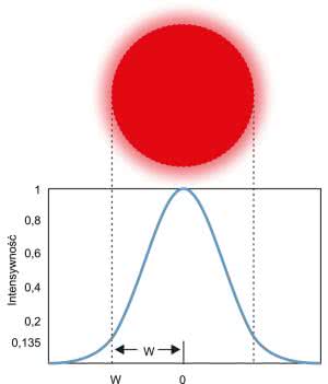 Średnica wiązki odnosi się do średnicy wiązki laserowej mierzonej na powierzchni wyjściowej obudowy lasera. Średnicę wiązki można zdefiniować na kilka różnych sposobów, a w przypadku wiązek o profilu gaussowskim – czyli takich, z jakimi w znakomitej większości mamy do czynienia w układach optycznych – typowo określa się ją szerokością 1/e2. Szerokość 1/e2 to odległość między dwoma punktami na rozkładzie krańcowym, których intensywności wynoszą 1/e2 maksymalnej amplitudy, czyli 0,135-krotność maksymalnej wartości intensywności. Zostało to zobrazowane na rysunku 3.