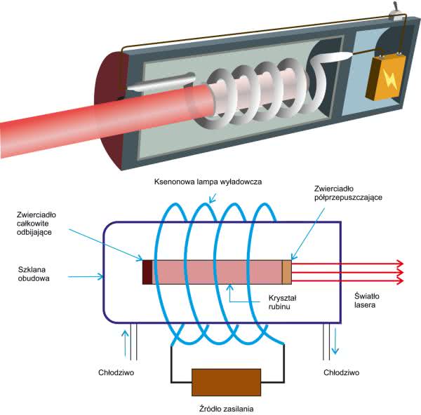 W przypadku zaprezentowanego na rysunku 2 lasera rubinowego, ośrodkiem aktywnym jest pręt wykonany z rubinu – tlenku glinu, domieszkowanego chromem. Ten rodzaj lasera pompowany jest optycznie, czyli za pomocą światła. Najczęściej pochodzi ono z impulsowej lampy wyładowczej (np. ksenonowej), która ma kształt spirali, owiniętej wokół pręta rubinowego. Układ pompowania, dostarczając energię do ośrodka aktywnego, wzbudza znajdujące się w nim cząsteczki. Wzbudzone cząsteczki spontanicznie emitują, jednak wraz z zwiększaniem intensywności pompowania, system dochodzi do stanu tzw. inwersji obsadzeń. Jest to, w fizyce statystycznej, stan ciała, w którym więcej jego cząsteczek znajduje się w stanie wzbudzonym, niż w podstawowym.