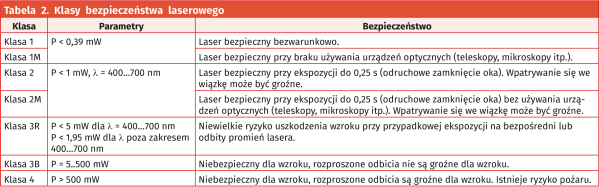 Ostatnim parametrem, jaki jest określany w dokumentacji dla urządzeń laserowych, jest klasa lasera. Jest to tzw. klasa bezpieczeństwa, która mówi o tym, jak duże ryzyko dla człowieka i otoczenia stanowi dany laser. Klasy lasera, zdefiniowane w normie IEC 60825, uzależnione są od mocy i długości fali lasera. Podsumowanie klas zgodnych z najnowszą iteracją wspomnianej normy zawarto w tabeli 2.
