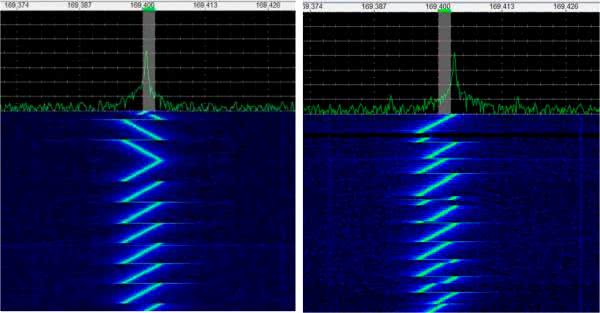 W przypadku komunikacji LoRa dane cyfrowe kodowane są w kierunku zmiany częstotliwości – z dołu do góry bądź z góry w dół (rysunek 3). Szerokość widma, jak i czas trwania świergotu zależne są od konkretnej implementacji (istnieje szereg standardowych wartości), która z kolei wynika m.in. z miejsca na świecie, gdzie używany jest system – różne kraje posiadają różne szerokości pasma i zakresy częstotliwości, przeznaczone dla komunikacji tego rodzaju.