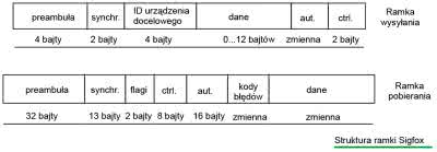 Ramka w komunikacji Sigfox jest dosyć skomplikowana. Dodatkowo, ramki przesyłane przez urządzenie (uplink) i do urządzenia (downlink) różnią się między sobą strukturą, a także maksymalną liczbą danych, jaką można w takiej ramce umieścić. Na rysunku 5 pokazano struktury obu ramek. W przypadku uplinku, ramkę rozpoczynają 4 bajty preambuły i 2 bajty synchronizacyjne. Następnie umieszczony jest w niej ID urządzenia docelowego (tj. bramki sieci) i payload, czyli przesyłane dane. Pakiet kończą bajty autoryzacyjne i tzw. FCS, czyli bajty kontrolne ramkę, pełniące rolę analogiczną do CRC w innych protokołach.