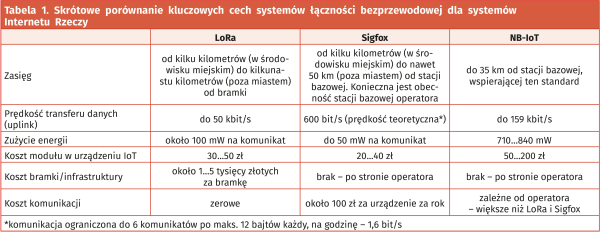 Grupę zamyka Narrowband-IoT – LPWANowy „kuzyn” LTE. Systemy korzystające z telefonii komórkowej do transmisji danych z rozproszonych elementów znane są jeszcze sprzed czasów popularyzacji hasła Internet Rzeczy, dlatego też w wielu aplikacjach NB-IoT może być najprostszym, chociaż niekoniecznie najlepszym wyborem. Łatwość migracji na to rozwiązanie może być w wielu aplikacjach usprawiedliwieniem wyższych kosztów urządzeń. jednak, zanim zdecydujemy się na taki krok, upewnijmy się, że w regionie aplikacji, operatorzy telefonii komórkowej zaktualizowali już stacje bazowe, aby zapewnić współpracę z LTE Cat NB1 lub LTE Cat NB2, zależnie od posiadanego przez nasze urządzenie modemu.