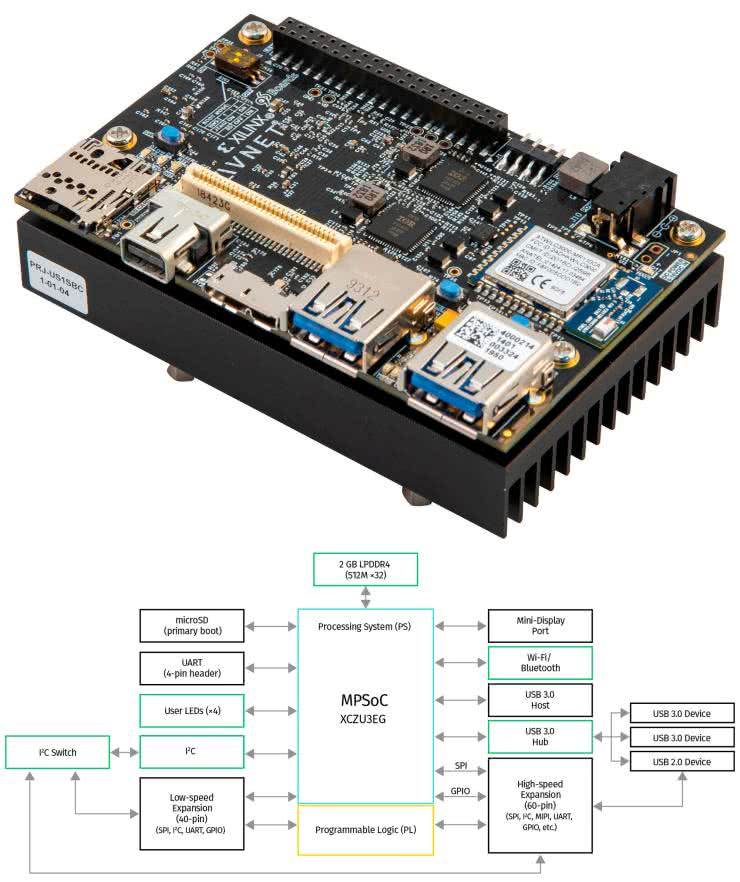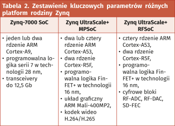Zynq jest w pełni programowalnym SoC, który łączy FPGA z tradycyjnym procesorem ARM Cortex (rysunek 6). Połączenie o wysokiej przepustowości oraz małych opóźnieniach między różnymi elementami architektury Zynq zapewnia interfejs bazujący na standardzie Advanced eXtensible Interface. Proces projektowania architektury Zynq ma kilka wspólnych kroków z układem FPGA. Najważniejszym etapem jest określenie specyfikacji i wymagań systemu, gdzie poszczególne zadania są przydzielane do realizacji w logice programowalnej (PL) lub w systemie przetwarzania (PS). Ten etap jest ważny, ponieważ wydajność całego systemu będzie zależała od zadań, które zostaną przydzielone do realizacji w najbardziej odpowiedniej technologii: sprzętowej lub programowej. Firma Xilinx przygotowała specjalne układy dla potrzeb Machine Learning zawierające architekturę Zynq – dostępne platformy to: Zynq-7000 SoC, Zynq UltraScale+ MPSoC, Zynq UltraScale+ RFSoC (tabela 2). Do szybkiego rozpoczęcia prac z architekturą Zynq UltraScale+ warto użyć gotowej płytki uruchomieniowej Ultra96-V2 od AVNET (rysunek 7).