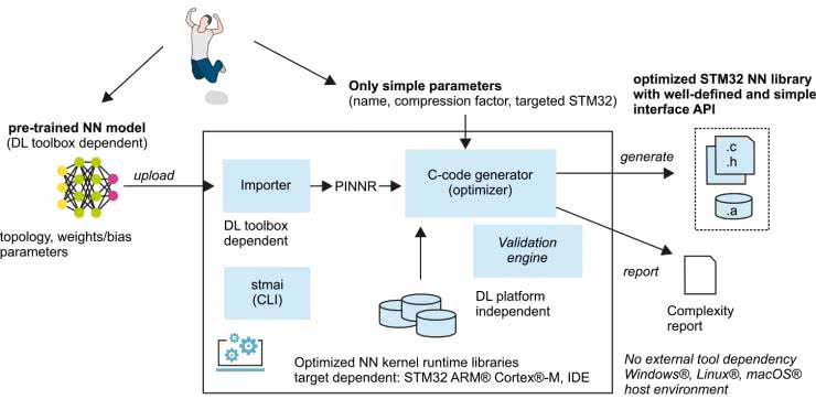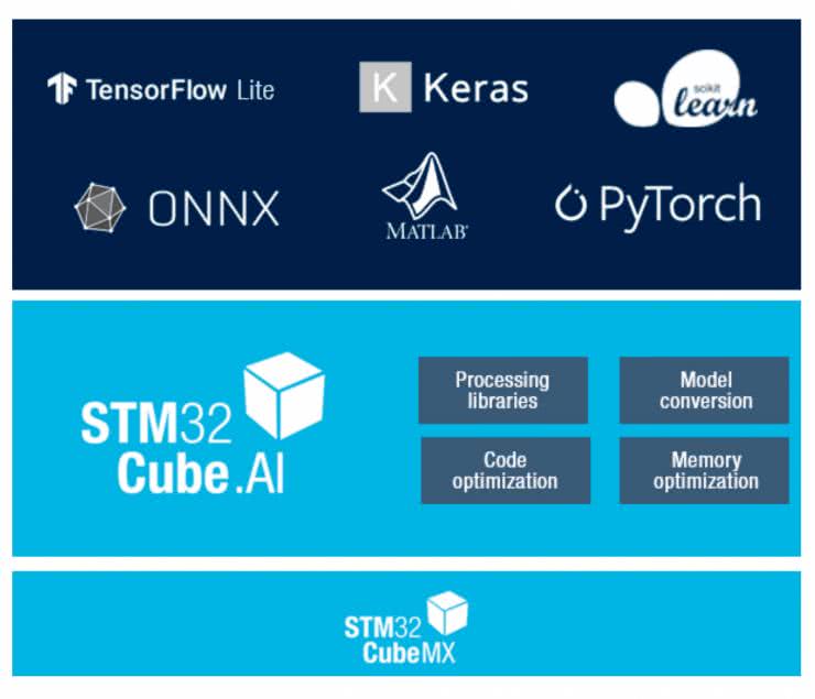 STM32Cube.AI jest częścią ekosystemu STM32Cube i obsługuje modele z głównych platform AI. Dla osób, które mają umiejętności projektowania AI i opracowały wstępnie predefiniowane własne modele ANN (Artificial Neural Networks), STM32Cube.AI zawiera również wiele przykładowych aplikacji. Dostępne są narzędzia do debugowania i zintegrowane biblioteki, aby szybko rozpocząć pracę z projektami AI na układach STM32.