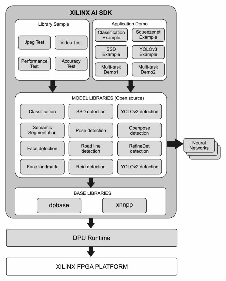 Pakiet oprogramowania Xilinx AI SDK jest zestawem bibliotek oraz interfejsów API (rysunek 8). Został opracowanych w celach wydajnego i zoptymalizowanego wykorzystania zasobów nawet w przypadku osób słabo znających zagadnienia z zakresu uczenia maszynowego czy układów FPGA. Zestaw narzędzi pozwala programistom skupić się na rozwoju ich aplikacji, nie wymagając często trudnych dla nich zadań polegających na konfiguracji logiki programowalnej. Zawiera liczną bazę bibliotek, m.in. przykładowe biblioteki analizy plików Jpeg, wideo oraz aplikacje demonstracyjne możliwe do uruchomienia w celach testowych. Biblioteki modeli zawierają wiele implementacji modeli sztucznej inteligencji, model detekcji twarzy, wykrywanie linii na jezdni i wiele innych (rysunek 8).