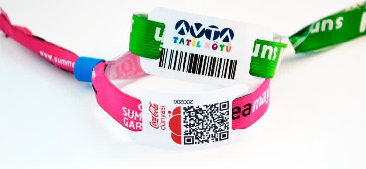 - Obsługa eventów – jednorazowe opaski wyposażone w kody kreskowe (fotografia 13) bądź wbudowane tagi RFID są powszechnie stosowane jako szybkie w obsłudze i bezpieczne (tj. odporne na fałszerstwa) bilety na rozmaite eventy – koncerty, festiwale, pokazy multimedialne etc. Mogą one współpracować z ręcznymi czytnikami użytkowanymi przez obsługę bądź z automatycznymi bramkami.