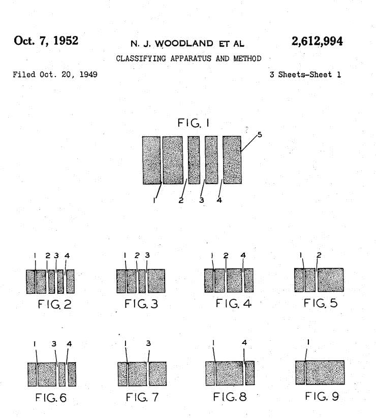 Wynalazcy kodu kreskowego i pierwszego przeznaczonego dla nich czytnika – Norman Joseph Woodland oraz Bernard Silver – zdecydowali się na zastosowanie pierwszej z opisanych technik. Zgłoszenia patentu na swoje – niezwykle innowacyjne jak na owe czasy – rozwiązanie dokonali w 1951 roku, zaś amerykańskie prawo ochronne o numerze US2612994 otrzymali rok później.