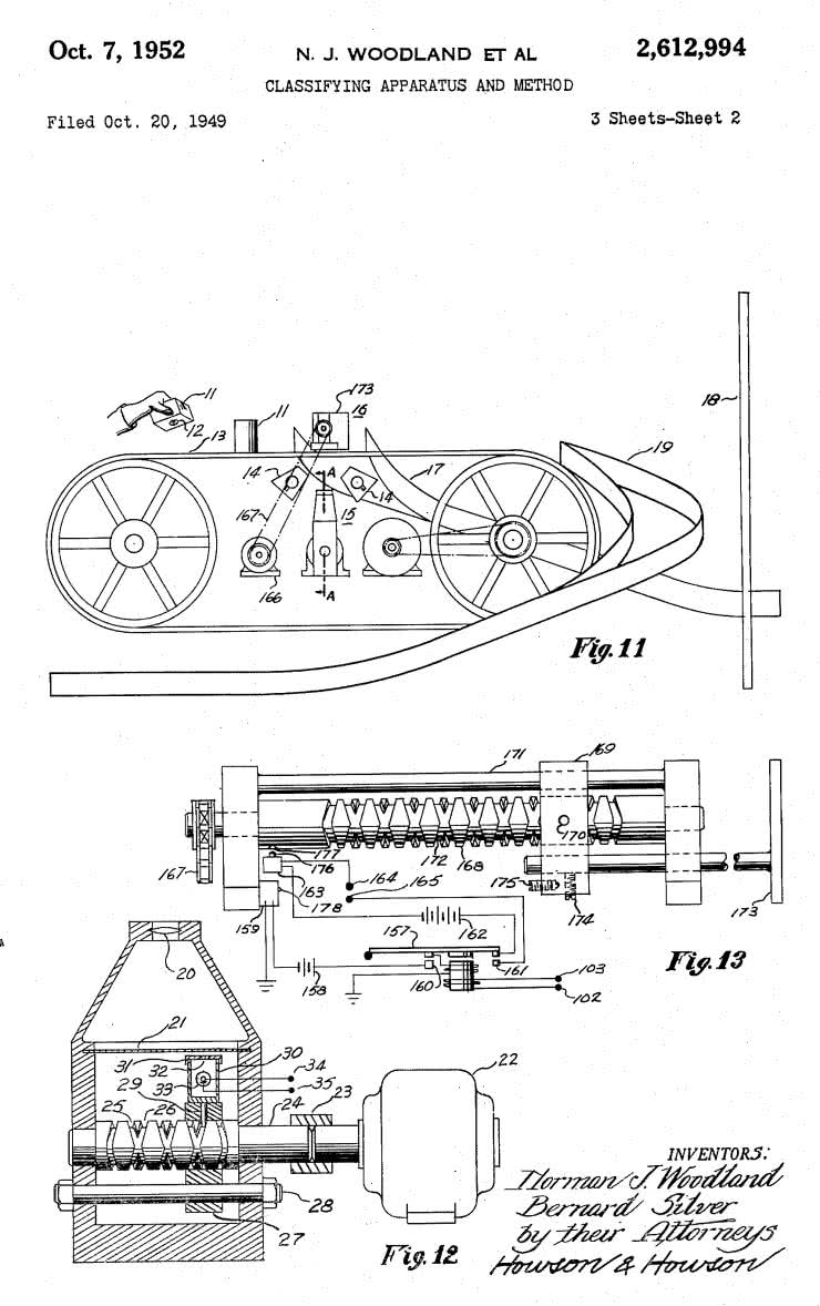 W dokumencie znajdujemy opis prostego kodu kreskowego (rysunek 3) oraz urządzenia odczytującego, bazującego na… przezroczystym przenośniku taśmowym, transportującym odpowiednio ułożone towary nad zespołem czytnika optycznego (rysunek 4). Choć nietrudno dziwić się, że rozwiązanie to zostało wyparte przez skanery laserowe, to zdecydowanie utorowało ono drogę nowej technologii automatycznej identyfikacji.