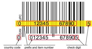 (EAN-8) jest stosowana na produktach o niewielkich wymiarach opakowania. - UPC-A – kod stosowany w handlu amerykańskim i kanadyjskim, był podstawą do opracowania EAN-13. Od strony technicznej (sposób kodowania cyfr i liczenia sumy kontrolnej) jest identyczny, a różnica jest widoczna tylko w graficznym ułożeniu numerycznej reprezentacji identyfikatora towaru, stanowiącej „podpis” umieszczony poniżej właściwego kodu. Dodatkowa cyfra na początku kodu EAN-13 (i zapisana poprzez sposób kodowania lewej grupy cyfr) pozwala bowiem rozszerzyć zakres numeracji na inne kraje świata (dla USA i Kanady ma ona wartość zero). Porównanie obydwu opisanych powyżej systemów pokazano na rysunku 6. Podobnie jak w przypadku EAN-13, także UPC-A doczekał się swojej skróconej wersji, oznaczonej UPC-E.
