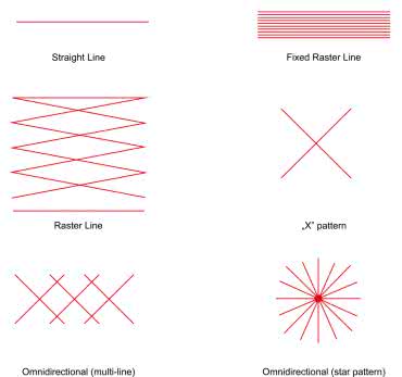 Opisany wcześniej skaner symbol LS9208 generuje podstawowy wzór 5 zestawów linii równoległych (po 4 na każdy z nich), rzutowanych pod różnymi kątami (fotografia 19) i dodatkowo przesuwanych przez drgające zwierciadło. Warto jednak wiedzieć, że producenci skanerów wielokierunkowych stosują często także zupełnie inne przebiegi wiązek laserowych – przykłady pokazano na rysunku 5. W każdym przypadku celem takich zabiegów jest umożliwienie odczytania kodów o różnych rozmiarach, umieszczonych pod dowolnym kątem względem obudowy skanera.