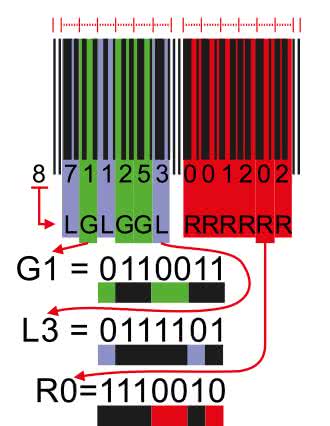 Na rysunku 8 pokazano przykładowy kod EAN-13, za pomocą którego zapisano identyfikator 8 711253 00120 wraz z sumą kontrolną (ostatnia cyfra 2). Pierwszy z trzynastu znaków decyduje o sposobie zapisu kolejnych cyfr – podczas gdy lewa grupa (711253) stosuje zapis kolejnych cyfr według kodowania parzystego (even – oznaczonego jako G) lub nieparzystego (odd – oznaczonego jako L), to prawa grupa (001202) zawsze jest zapisywana z użyciem kodowania parzystego (R – patrz tabela 1).