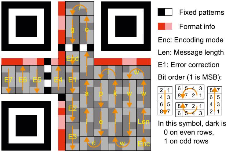 Ułożenie danych w obszarze poza opisanymi wcześniej strefami specjalnymi jest dość intuicyjne (rysunek 12). Jak widać, każdy znak kodu jest zapisywany w formacie 8-bitowym według jednej z czterech możliwych konfiguracji, zależnych od położenia danego elementu na drodze wirtualnej „ścieżki odczytu”. Dodatkowe pole (Len) pozwala na zakodowanie długości danych. Warto dodać, że w zależności od wybranego formatu kody QR mogą pracować także z danymi alfanumerycznymi, liczbowymi bądź ze znakami Kanji oraz Kana, przy czym w celu zapisu znaków o liczbie bitów różnej od 8 stosowane są odpowiednie metody konwersji i uzupełniania.
