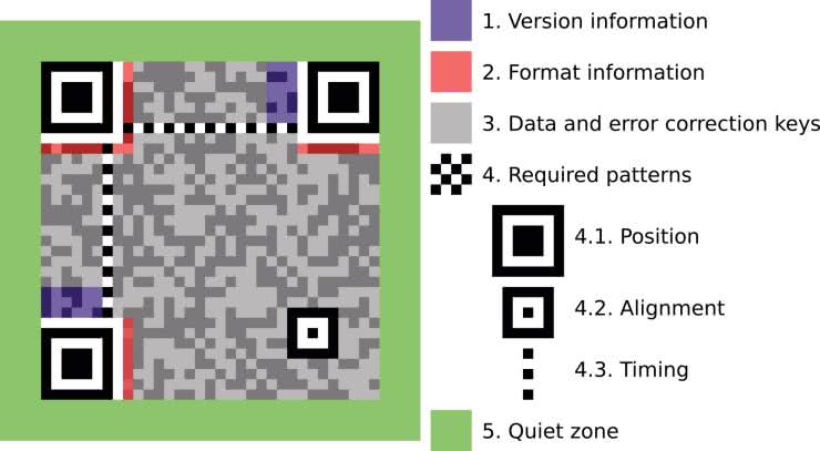 Na rysunku 11 zaprezentowano najważniejsze strefy wymagane w kodzie QR w wersji 7 (45×45 modułów). Strefa „ciszy” (zielony obszar) powinna mieć szerokość przynajmniej 4 modułów z każdej strony kodu. Trzy kwadratowe znaczniki pozycji są umieszczone w rogach kodu, zaś dodatkowe markery wyrównujące – w zależności od rozmiaru (wersji) kodu – w równej macierzy „zsynchronizowanej” geometrycznie z wewnętrznymi krawędziami znaczników pozycyjnych. Dodatkowo, w kodzie „zaszyte” są informacje o tzw. timingu (pozwalające oprogramowaniu wizyjnemu na narzucenie niezbędnego do dalszej analizy układu kartezjańskiego) oraz jego wersji (niebieskie pola obok leżących po przekątnej znaczników pozycyjnych) i formacie (czerwone obszary obok wszystkich markerów pozycji).
