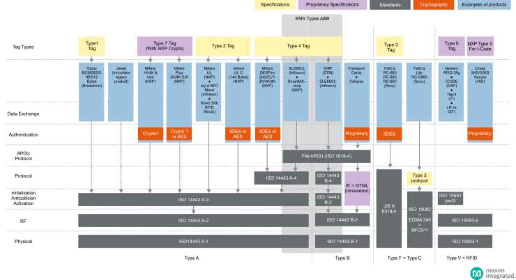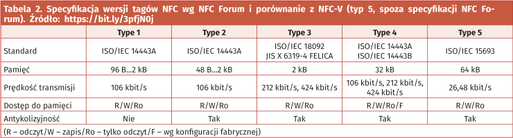 Co więcej – rodzaje tagów określone przez międzynarodową organizację NFC Forum (Type 1…Type 4 – tabela 2) korzystają nie tylko z obydwu wersji 14443A/B, ale także z japońskiego standardu FeliCa (JIS X 6319-4 – Specification of implementation for integrated circuit(s) cards – Part 4: High speed proximity cards) – intensywnie eksploatowanego w Japonii i Singapurze.