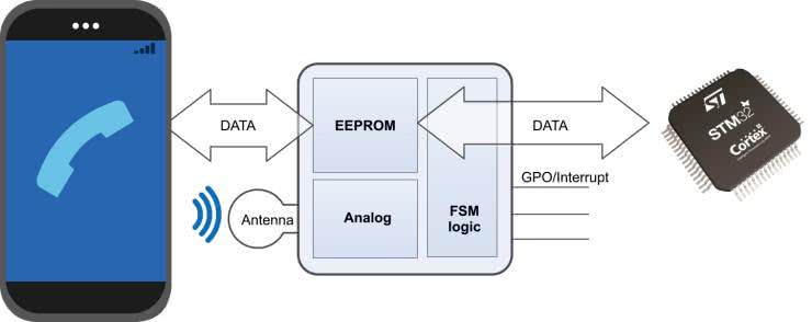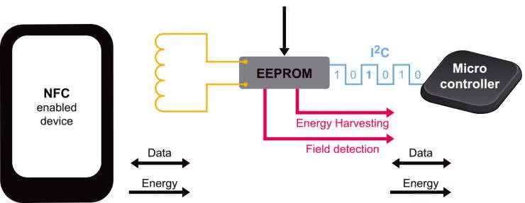 Co więcej, nowsze układy scalone realizujące funkcję konwencjonalnych tagów NFC mogą być także znacznikami dynamicznymi. W tym przypadku pamięć nieulotna (EEPROM), której odczyt i/lub zapis realizuje zewnętrzne urządzenie (specjalizowany czytnik, smartfon, tablet, etc.) za pośrednictwem komunikacji zbliżeniowej, może być także obsługiwana „z drugiej strony”, tj. za pośrednictwem interfejsu lokalnego (najczęściej I²C), przez mikrokontroler znajdujący się w urządzeniu pełniącym funkcję znacznika (rysunek 16).