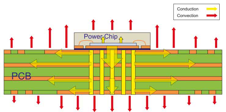 Omówiona wcześniej odporność temperaturowa obudów oraz ich ewentualne właściwości ogniotrwałe, w żadnym wypadku nie wyczerpują tematyki zagadnień termicznych. Oprócz wytrzymałości na działanie zewnętrznych źródeł ciepła, w wielu przypadkach konieczne jest także zapewnienie odpowiedniego odprowadzania go z elementów znajdujących się wewnątrz obudowy urządzenia. Jeżeli moc strat jest niewielka, często w zupełności wystarczającym sposobem chłodzenia okazuje się odpowiednio zaprojektowana płytka drukowana, która – za pomocą ścieżek, pól masy oraz przelotek – jest w stanie skutecznie odbierać ciepło (na drodze przewodzenia) z układów scalonych i/lub elementów dyskretnych, a następnie odprowadzać je do otoczenia poprzez konwekcję oraz – w znacznie mniejszym stopniu – promieniowanie termiczne (rysunek 5).