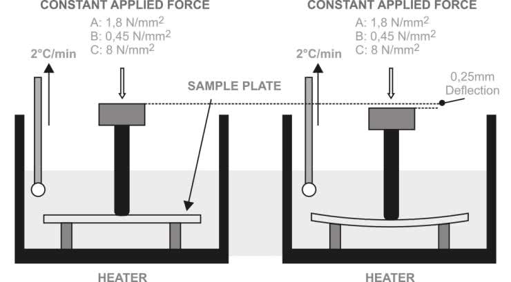 W praktyce często spotkać się można także z odniesieniami do badań wg standardów ISO 75 i ASTM D648 – w tym przypadku mierzone jest jednak nie zagłębienie igły w powierzchni materiału, ale ugięcie podłużnej próbki (belki) w układzie wg rysunku 1. W przypadku wspomnianego wcześniej ABS, wykorzystywanego przez firmę OKW, temperatury ugięcia pod obciążeniem mierzone metodą ISO 75 wynoszą: 89°C dla nacisku 0,45 MPa oraz 76°C dla nacisku 1,80 MPa.