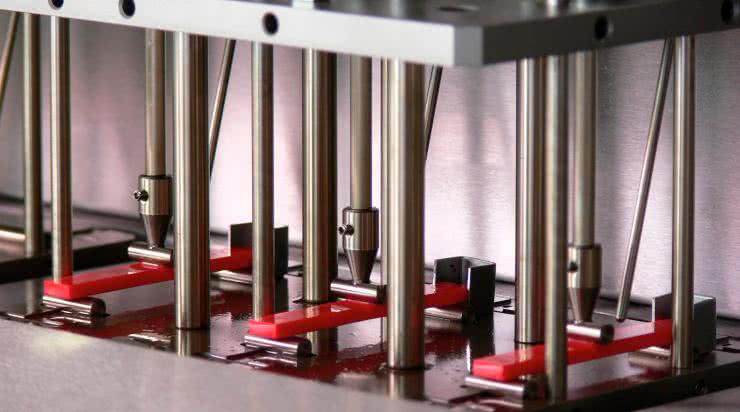 Kolejnym niezwykle istotnym parametrem termicznym tworzyw sztucznych pozostaje temperatura mięknienia, wyznaczana metodą Vicata. Pomiar okazuje się konieczny z użytkowego punktu widzenia – podczas gdy temperatura zeszklenia jest parametrem stosowanym szeroko w materiałoznawstwie, ale wymagającym zaawansowanych technik pomiarowych, metoda Vicata jest znacznie bardziej użytecznym narzędziem z punktu widzenia zastosowań konstruktorskich. Podczas pomiaru niewielką sondę – w postaci igły o płaskiej końcówce o powierzchni 1 mm² (fotografia 9) – dociska się stałą siłą (10 N dla metody Vicat A lub 50 N dla Vicat B) do powierzchni stopniowo podgrzewanej próbki materiału. Zagłębienie końcówki na głębokość 1 mm wyznacza koniec testu, a panująca wtedy temperatura oznacza wartość progu mięknięcia (Vicat softening point), podawaną przez producentów w notach katalogowych. I tak, ABS UL 94 HB stosowany przez markę OKW ma temperaturę mięknięcia (wg metody B50, tj. przy wzroście temperatury o 50°C/h) równą 90°C. Metoda Vicata jest określana przez normy ISO 306 oraz ASTM D1525.