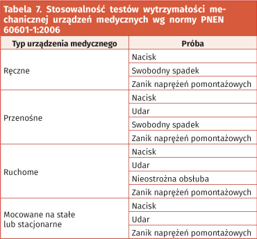 Jako przykład wymagań stawianych urządzeniom elektronicznym pod względem wytrzymałości mechanicznej przywołamy normę 60601-1, dotyczącą zagadnień bezpieczeństwa podstawowego i funkcjonowania zasadniczego elektrycznych urządzeń medycznych, która w sekcji 15.3.1 definiuje tabelę stosowalności testów wytrzymałości mechanicznej (tabela 7).