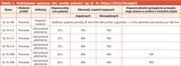 Oprócz odporności temperaturowej, polimery wykorzystywane do produkcji obudów muszą przechodzić także skrupulatne testy palności, których celem jest zniwelowanie ryzyka podtrzymywania oraz rozprzestrzeniania pożaru. W tym celu materiały poddawane są badaniom wg standardu UL 94, zharmonizowanego zresztą z normami IEC 60707, IEC 60695-11-10, IEC 60695-11-20, ISO 9772 oraz ISO 9773. W tabeli 4 pokazano podsumowanie warunków testu dla sześciu klas zdefiniowanych przez UL 94.