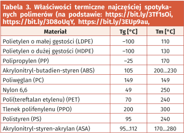 O ile przy zastosowaniu obudów metalowych (zwykle aluminiowych lub stalowych) zagadnienie odporności termicznej nabiera znaczenia dopiero przy skrajnie wysokich temperaturach (rzecz jasna całkowicie osobny temat to wytrzymałość znajdującej się wewnątrz elektroniki), o tyle w przypadku tworzyw sztucznych problem pojawia się w znacznie niższym zakresie temperatur. Przekroczenie temperatury zeszklenia (oznaczanej zwykle jako Tg) powoduje zapoczątkowanie stopniowego mięknięcia materiału przez zmiany ułożenia łańcuchów polimeru na poziomie makroskopowym. W przypadku większości popularnych tworzyw sztucznych (tabela 3) temperatura zeszklenia nie przekracza 105°C, stąd też bezpieczny zakres temperatur pracy tych materiałów dochodzi zaledwie do kilkudziesięciu stopni Celsjusza (w przypadku ABS podaje się zwykle wartość graniczną na poziomie 70...80°C).