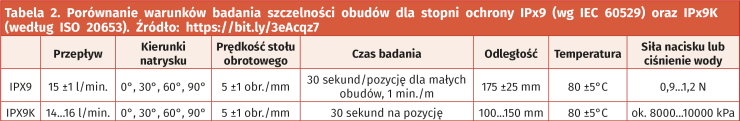 W praktyce dość istotne może być rozróżnienie definicji wyższych klas IP69 oraz IP69K. Pierwsza z nich pochodzi z oryginalnej normy „elektrycznej” IEC 60529 (w normie tej nie figuruje dodatkowy prefiks K, a cały dokument dotyczy aparatury elektrycznej jako takiej) i oznacza ochronę przed bardzo silną strugą wody pod wysokim ciśnieniem i o podwyższonej temperaturze (do 80°C), przy czym standard definiuje też odległość powierzchni obudowy od dyszy (175 mm ±25 mm) i siłę wywieraną przez strumień na badaną powierzchnię (0,9...1,2 N). Dość często spotykana klasa IP69K pochodzi natomiast z motoryzacyjnej normy ISO 20653 – zamiast siły wywieranej przez wodę uderzającą w powierzchnię badanego obiektu, definiuje ona zakres ciśnienia wody (80....100 bar z przepływem 14...16 l/min). Nieco inny jest także przedział odległości od dyszy do powierzchni (100...150 mm). Porównanie zapisów obu norm pokazano w tabeli 2.