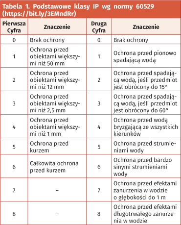 Jednym z kluczowych parametrów świadczących o odporności środowiskowej obudowy – niezależnie od materiału, z którego została wykonana – jest stopień ochrony IP, zwany też klasą szczelności IP i w równym stopniu dotyczący także wszelkich elementów zewnętrznych (np. złączy, dławnic i przepustów kablowych). Na rodzimym gruncie tematykę tę reguluje norma PN-EN 60529:2003, obejmująca obudowy urządzeń elektrycznych o napięciu znamionowym nieprzekraczającym 72500 V. Pierwsza cyfra oznaczenia informuje o stopniu ochrony przed penetracją przez ciała stałe i to w bardzo szerokim zakresie rozmiarów (od większych obiektów rzędu 50 mm, aż do drobnych pyłów), druga zaś koduje ochronę przed przenikaniem wody do wnętrza obudowy. Im wyższy numer, tym lepsza odporność produktu w zakresie kierunkowości i ciśnienia wody: przykładowo, klasa IPx1 chroni zaledwie przed wodą swobodnie spadającą (pionowo), zaś IPx2 dopuszcza także obrócenie obudowy o 15°. Klasy IPx7 i IPx8 dotyczą już produktów odpornych na zanurzenie w wodzie. W niektórych przypadkach można także spotkać się z oznaczeniem zawierającym więcej znaków – dodatkowe litery (A, B, C, D, H, M, S lub W) stosuje się jako nieobowiązkowe uzupełnienia (przykładowo: H dotyczy aplikacji wysokonapięciowych). Podstawowe klasy IP (do IP68 włącznie) zebrano w tabeli 1.