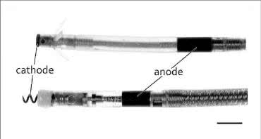 - konstrukcja koncentryczna (coaxial) – końcówka elektrody (katoda) jest podłączona za pomocą środkowego przewodu spiralnego, osłoniętego cienką warstwą izolacji od zewnętrznego oplotu, łączącego wtyk stymulatorowy z pierścieniem anody (fotografia 8). Całość jest pokryta zewnętrzną izolacją, bezpośrednio kontaktującą się z ciałem pacjenta.