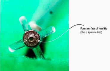 - Elektrody z mocowaniem pasywnym (rysunek 8) mają obłą (zwykle sferyczną lub spłaszczoną) końcówkę o silnie chropowatej powierzchni (fotografia 5), ułatwiającej wrastanie w tkankę i zwiększającej efektywną powierzchnię kontaktu elektrycznego. Implantacja odbywa się poprzez dociśnięcie elektrody do mięśnia sercowego, najczęściej w rejonie koniuszka prawej komory – miejsce to, z uwagi na duże zagęszczenie tzw. beleczek mięśniowych, doskonale „współpracuje” z niewielkimi haczykami, które zakleszczając się w rozbudowanej strukturze miokardium powodują zablokowanie elektrody w pożądanej pozycji (gwoli ścisłości należy wspomnieć, ze istnieje też możliwość fiksacji elektrod pasywnych w prawym przedsionku). Do zalet tego rozwiązana należy zaliczyć mniejszą inwazyjność implantacji, która nie wiąże się z bezpośrednim uszkodzeniem mięśnia sercowego.