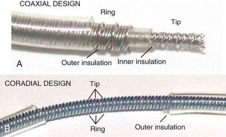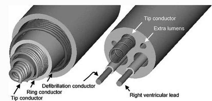 W przypadku wszczepialnych kardiowerterów-defibrylatorów (ICD) istnieje konieczność poprowadzenia – oprócz przewodów służących do detekcji spontanicznej aktywności serca oraz ewentualnego przesyłu słabych impulsów stymulujących – także dodatkowego okablowania, umożliwiającego dostarczanie do miokardium wysokonapięciowych wyładowań podczas procedury kardiowersji lub defibrylacji. Choć istnieje możliwość wyprodukowania przewodów koncentrycznych o liczbie przewodników przekraczającej 2 (rysunek 10), to w praktyce stosuje się podejście określane mianem multilumen design.