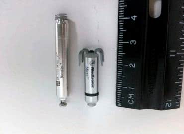 Porównanie rozmiarów dwóch wprowadzonych do klinicznego użytku konstrukcji rozruszników bezelektrodowych – Micra TPS (wyprodukowanego przez firmę Medtronic) oraz Nanostim (marki St. Jude Medical) zostały pokazane na fotografii 9.