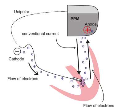 Pierwsze rozruszniki serca korzystały z elektrod mocowanych na zewnętrznej powierzchni mięśnia sercowego (tzw. elektrody nasierdziowe), co umożliwiało chirurgom umiejscowienie wyprowadzeń wyjściowych generatora dokładnie tam, gdzie było to konieczne z medycznego punktu widzenia. Przejście na elektrody implantowane z dostępu naczyniowego spowodowało jednak, iż konstruktorzy rozruszników zaczęli wykorzystywać tytanową obudowę urządzenia jako anodę, zaś do wnętrza serca wszczepiana była tylko sama katoda (rysunek 3).