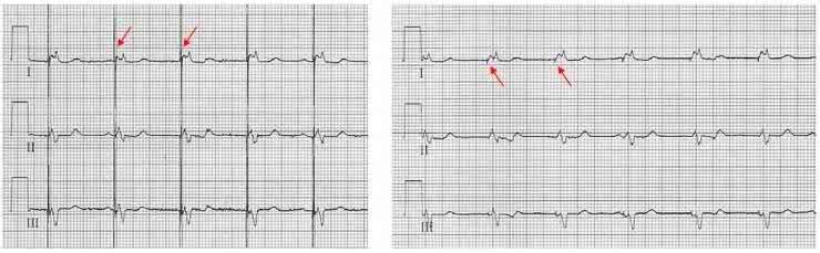 Z uwagi na szeroki obszar tkanek pacjenta objęty polem elektrycznym (wytwarzanym podczas impulsu pomiędzy katodą, a obudową stymulatora), w zapisach EKG u pacjentów z wszczepionymi elektrodami unipolarnymi można zauważyć bardzo wyraźne „szpilki” odpowiadające impulsom stymulatora (rysunek 4), choć – z drugiej strony – w niektórych przypadkach zbyt silne artefakty mogą utrudniać właściwą obserwację i interpretację sygnału elektrokardiograficznego, zwłaszcza w uproszczonych konfiguracjach odprowadzeń o zmniejszonej liczbie kanałów pomiarowych. Stymulacja unipolarna ma jednak szereg znacznie istotniejszych wad, do których zaliczyć należy m.in. większą podatność na artefakty pochodzenia pozasercowego (co nie dziwi z uwagi na fakt, iż wzmacniacz wejściowy stymulatora zbiera sygnał z większego obszaru ciała, w dodatku o dość wysokiej impedancji) oraz ryzyko przypadkowego pobudzenia pobliskich mięśni lub nerwów obwodowych.