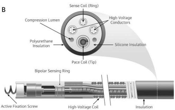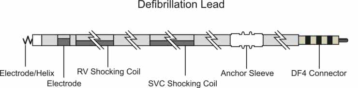 Wszczepialne kardiowertery-defibrylatory korzystają z bardziej rozbudowanych elektrod, posiadających dodatkowe powierzchnie stykowe, przeznaczone do dostarczania wysokonapięciowych impulsów w prawej komorze serca oraz żyle głównej górnej (SVC – superior vena cava). Przykładowe rozwiązanie pokazano na rysunku 6.
