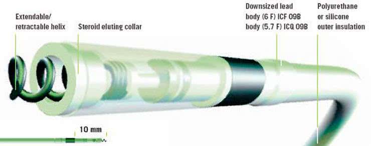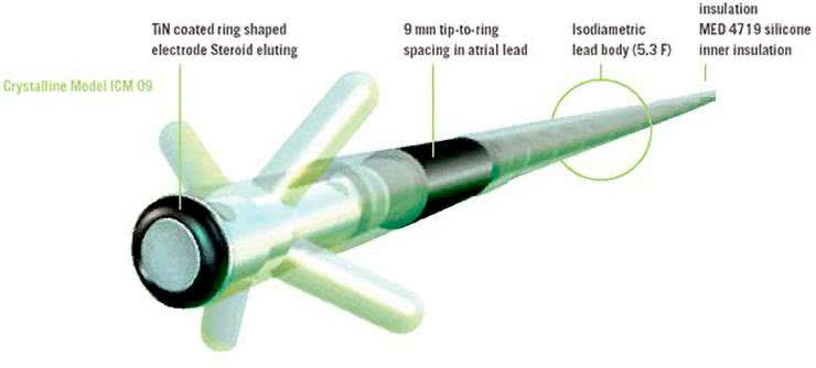 Zarówno elektrody z mocowaniem pasywnym, jak i modele wyposażone w końcówkę do fiksacji aktywnej, są dziś powszechnie wyposażane w nośniki leków steroidowych (gł. octanu deksametazonu – DXA), którego celem jest zapobieganie ostremu lub przewlekłemu zapaleniu tkanki wokół elektrody. Stany zapalne w dłuższym okresie eksploatacji rozrusznika powodują bowiem powstawanie zwłóknień otaczających punkt implantacji elektrody i prowadzących do stopniowego pogarszania kontaktu elektrycznego katody z mięśniem sercowym, co w efekcie podwyższa wymagany próg czułości stymulatora oraz zwiększa poziom energii, niezbędnej do efektywnego wywołania skurczu. Nietrudno domyślić się zatem, że konsekwencją stosowania aktywnych farmakologicznie elektrod jest… oszczędność energii i wydłużenie czasu pracy stymulatora. Pierścienie zawierające nośniki leków – zarówno w elektrodach do mocowania aktywnego, jak i pasywnego – zostały odpowiednio oznaczone na rysunkach 8 i 9.