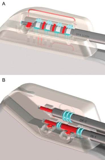 Warto zwrócić uwagę na konstrukcję gniazd, współpracujących z wtykami IS i DF. Po wpięciu elektrody do gniazda (co odbywa się rzecz jasna na chwilę przed włożeniem stymulatora do loży podskórnej) konieczne jest zablokowanie złącza przed przypadkowym rozpięciem. W tym celu stosowane są samouszczelniające śruby, dociskające wtyk do kanału, wykonanego w bloku złączy. Niezwykle ważne jest jednak także uszczelnienie wlotu gniazda – wszechobecne płyny ustrojowe (głównie krew) mogą bowiem z łatwością penetrować wszelkie nieszczelności w konstrukcji urządzenia. Dlatego też producenci implantów aktywnych stosują wielopoziomowe uszczelnienia, a dodatkowo – każda uszczelka posiada dwie wargi, co zapewnia minimum redundancji, tak ważnej w technologii medycznej. W przypadku złączy IS-1 i DS-1 uszczelka jest wykonana przez zgrubienie na zewnętrznej izolacji elektrody, które współpracuje z odpowiednio ukształtowanym i niezwykle precyzyjnie spasowanym kanałem. Złącza IS-4 i DS-4 są jednak pozbawione własnych uszczelnień, a kształt części wpinanej do gniazda jest w przybliżeniu gładkim walcem. Dlatego też odpowiednie uszczelnienia muszą być wprowadzone bezpośrednio do gniazda – tutaj także stosuje się niezbędną redundancję uszczelek, zainstalowanych pomiędzy każdą parą styków oraz na wlocie gniazda. Konstrukcję gniazd pokazano na rysunku 16.