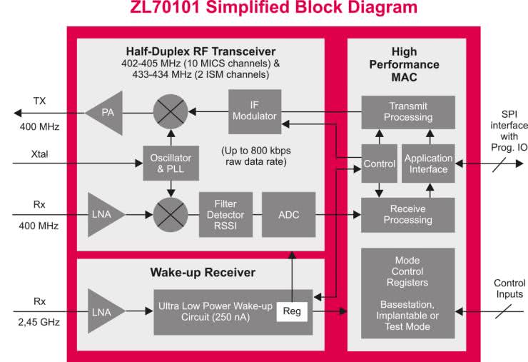 Programowanie parametrów urządzenia – dawniej przeprowadzane za pośrednictwem cewki indukcyjnej przykładanej w okolicę miejsca implantacji – dziś zostało zdominowane przez krótkozasięgowe łącza radiowe. Ustawianie i kontrola parametrów stymulatora oraz odczyt rozbudowanego pakietu danych diagnostycznych (dotyczących tak samego urządzenia, jak i fizjologii pacjenta) jest podstawową funkcjonalnością wszystkich współczesnych implantów elektrokardiologicznych. Standardem komunikacyjnym, który ukształtował dzisiejszy świat elektroniki implantowalnej, jest MICS – Medical Implant Communication System – opracowany przez FCC w 1999 roku i „wchłonięty” przez nowszy, udostępniony 10 lat później standard MedRadio (Medical Device Radiocommunications Service). Pierwszy z nich opierał się na paśmie 402–405 MHz, drugi rozszerzył je o 1 MHz z każdej strony. Kolejne edycje uzupełniły całość o podzakres pasma S, wykorzystywany w sieciach MBAN (Medical Body Area Network) – 2360–2400 MHz, a także o kolejne 24 megaherce w podprzedziałach 413–419 MHz, 426–432 MHz, 438–444 MHz oraz 451–457 MHz. Z biegiem czasu na rynku pojawiły się nawet dedykowane do celów medycznych transceivery scalone, np. układ ZL70101 (rysunek 24), intensywnie wykorzystywany m.in. przez firmę Biotronik w zastosowaniach telemetrycznych. Transceiver zapewnia dwukierunkową komunikację w paśmie 400 MHz oraz dodatkowy front-end 2,45 GHz, umożliwiający wybudzanie układu ze stanu uśpienia przez zewnętrzny kontroler.