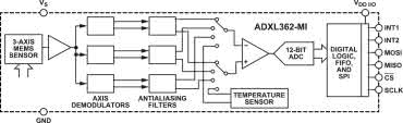 Fizjologiczną reakcją organizmu na wysiłek fizyczny lub stany emocjonalne jest przyspieszenie częstości akcji serca. W przypadku „awarii” naturalnego rozrusznika (węzła zatokowo-przedsionkowego) odpowiedzialność za ten parametr spoczywa na kardiostymulatorze – generowanie impulsów ze stałą częstotliwością uniemożliwiałoby bowiem właściwe ukrwienie organów wewnętrznych i mięśni szkieletowych (co było zresztą jedną z głównych wad stymulatorów w pierwszych dwóch dekadach ich rozwoju). Dziś regulacja rytmu sterowana przez sygnał z wbudowanego akcelerometru jest standardem we współczesnych rozrusznikach. Rzecz jasna, koniecznością jest tutaj zastosowanie niskomocowego czujnika, który nie nadweręży budżetu energetycznego urządzenia. Firma Analog Devices opracowała czujnik spełniający to wymaganie – układ ADXL362-MI (rysunek 26) pobiera zaledwie 1,8 µA prądu zasilania podczas pomiaru z częstotliwością próbkowania równą 100 Hz, zaś w trybie aktywacji ruchem – zaledwie 270 nA. Jest to zresztą jeden ze stosunkowo niewielu układów, przeznaczonych explicite do urządzeń implantowalnych, czy w ogóle do wyrobów medycznych klasy III (tematyka metod doboru komponentów do takich aplikacji nadawałaby się zresztą co najmniej na osobny artykuł).